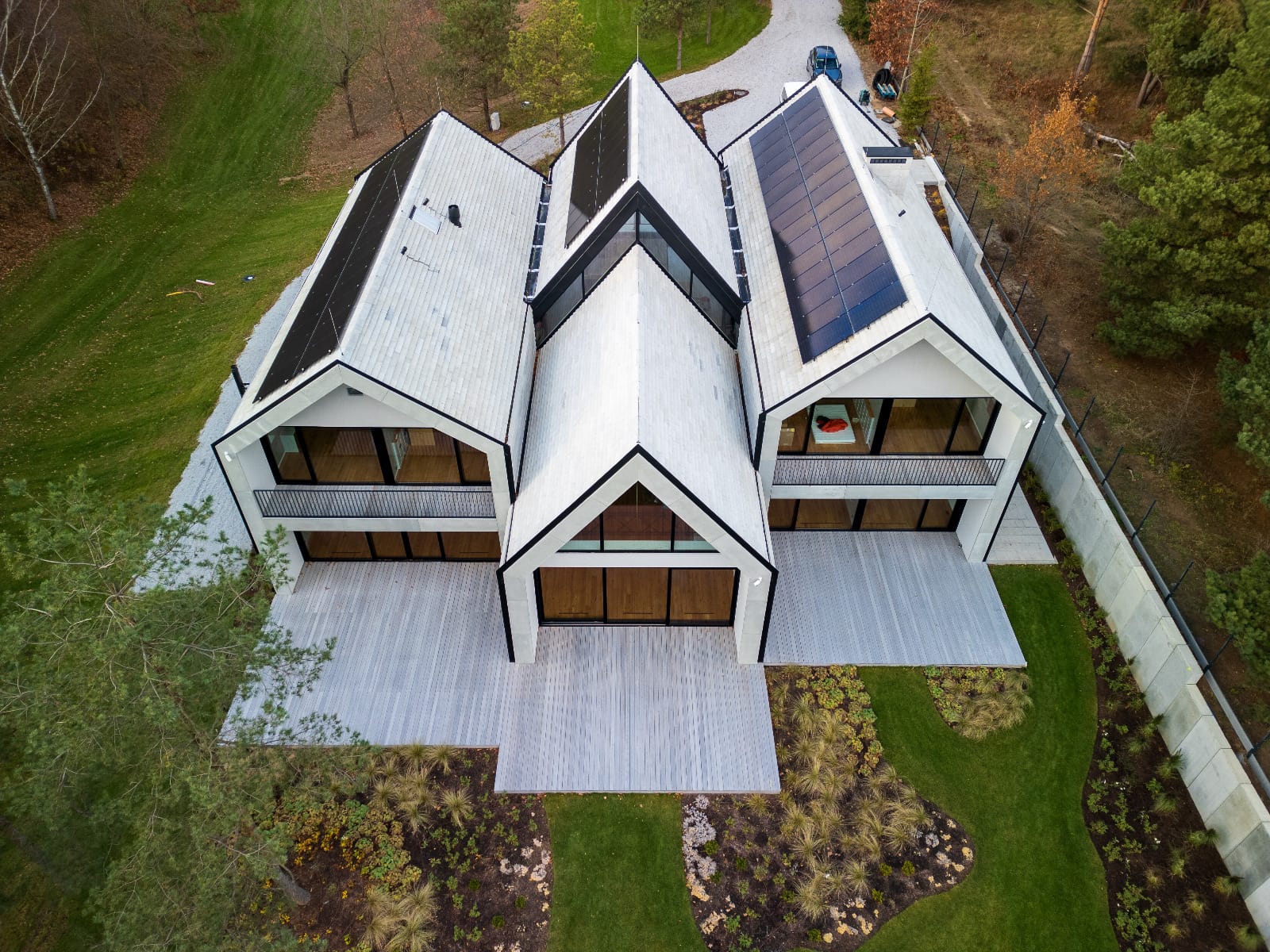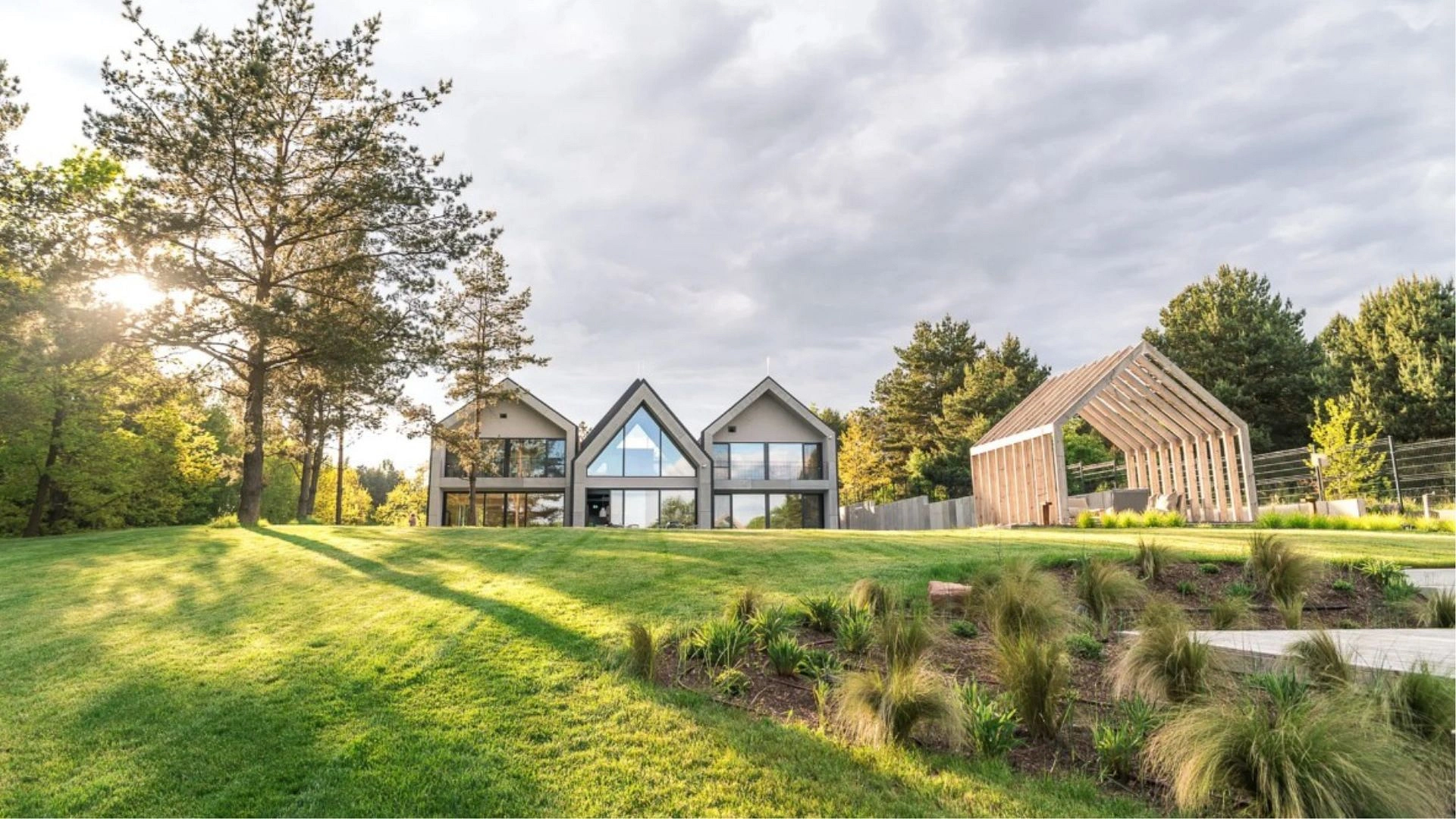 - The holiday center was designed on plots of land located in Łukta (Warmian-Masurian Voivodeship), directly adjacent to Lake Isąg.The plot has a unique terrain. It is very diverse in terms of height. Its highest part runs along the northern border of the plot and slopes significantly towards the lake, in addition, there are ravines along the longer side of the plot. The difference in height across the plot is about 17m. The local plan designates the lake's natural environment protection zone in a strip 100m from the shore. The plot is covered with numerous trees and shrubs.Cubature development is possible on the plot outside the lake protection zone. It consists of a guesthouse and 8 recreational houses. The guesthouse is located parallel (4 m) to the north-eastern border of the plot, at the very border of the lake protection zone, overlooking the water. The area in front of the guesthouse on the lake side will need to be lowered, and a retaining wall will have to be built on the border with the neighboring plot.Recreational houses have been located in such a way as to provide them with as much privacy as possible, the distances between houses vary between 15-20m. Two houses are located on the north side of the ravine, six others on the south side, each of them slightly (15 °) turned relative to the neighbor.Road communication is only possible along the north-eastern border of the plot. In the upper part of the plot, there is a car park with 15 parking spaces. It is possible to access the guesthouse via a paved road, 2 parking spaces for disabled people have been designed near the entrance to the building. In the southern part of the ravine, a wooden gangplank has a footpath leading along the planned watercourse to the lake.Children's playgrounds and elements of small architecture (gazebos, benches, terraces, and a pier) will be designed to make your rest pleasant.The body of the guesthouse has been designed as a sequence of 3 houses with gable roofs with different inclination angles (35 °, 40 ° and 50 °), arranged parallel to the ridge. The building was designed as a two-story building. Due to the difference in levels, only the upper floor is visible from the entrance to the building. Two full storeys can be seen from the lake side and from the ravine side. On the upper floor there is a reception and hotel rooms with bathrooms, on the lower floor there is a communal dining room, catering facilities and a multifunctional room. The storeys are connected with each other by an elevator and an open staircase, single-speed, leading from the entrance area to the dining room. An apartment adapted to the needs of the disabled is located on the lower floor.The representative nature of the entrance-reception and dining area is emphasized by the glazing of the entire gable walls of the central part of the building and the visible steel structure in the form of braced double-T frames. The guesthouse is designed in a mixed structure - reinforced concrete and steel. The elevations are made of artisanal brick tiles in natural colors that harmonize with the forest character of the plot, which cover both the walls and the roof of the building. Recreational houses are designed as simple, single-storey blocks consisting of two identical parts with gable roofs (45 °). One part consists of a hall, bathroom, kitchen with dining area and a small living room, the other part of two bedrooms. A mezzanine has been designed above the kitchen and dining room, which can accommodate a double bed or a playroom for older children. Access to the mezzanine would be via a ladder that could be put away so that smaller children would not be able to climb up.The usable area of the house without a mezzanine is about 63 m2, it is planned to build extensive terraces surrounding the house, adjusting to the topography around it. The houses are planned as repetitive, while the terraces will be designed individually for each location, so as to properly match the slopes and views.The houses were planned on the plot in such a way that the glass gable wall of the living room faces the lake. The façades of the house are designed with vertically arranged wooden boards, large glazing and a light gray seam roof.